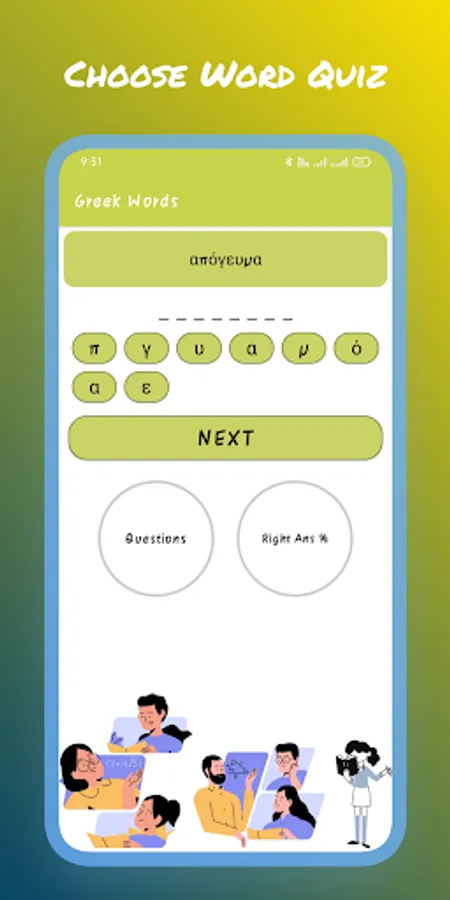 After the completion of the first segment, the quiz section starts from the Q/A quiz section. Learners will get a series of jumbled words one by one and have to rearrange the letters for making a meaningful word. This quiz round of learning Greek words contains easy as well as tough jumbled words so that users of any age can play the quiz. Learners will rearrange the words just by tapping on the letters.