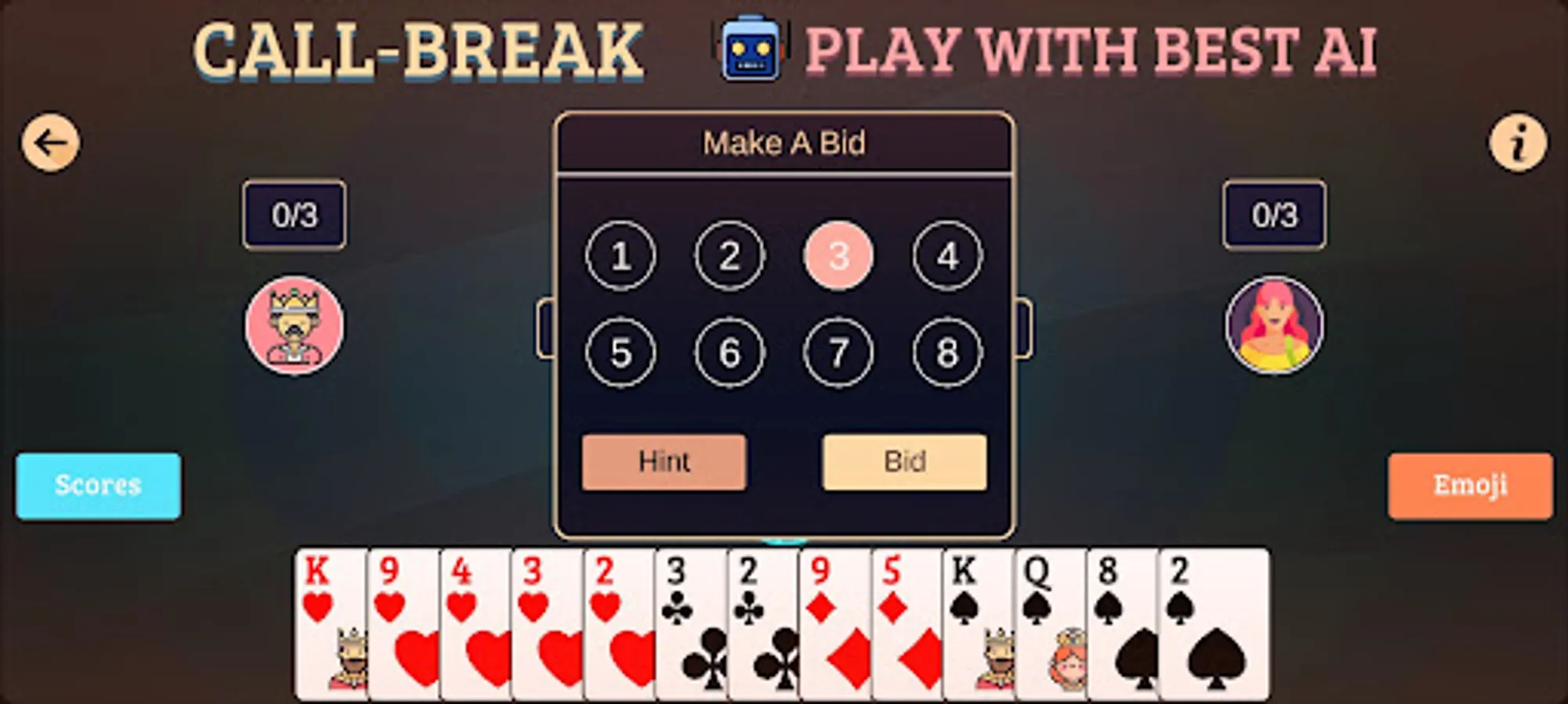 Play callbridge most popular card game in South Asian countries on your mobile device. It is an addictive and easy to play card game. This game is similar to a spades card game. If you like spades then you will probably like the callbridge card game also or you can start your card game adventure with the callbridge game.