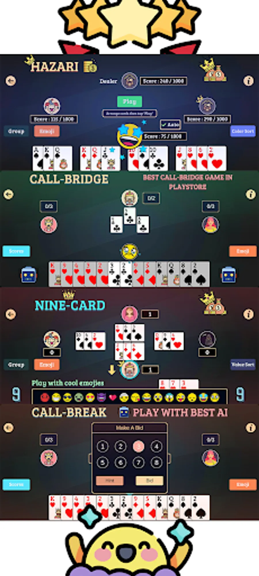 Get hazari a thousand point card game, ninecard, callbreak and callbridge free card games in one app. Every month we will add a new free card game so if you are a card game lover download it now.