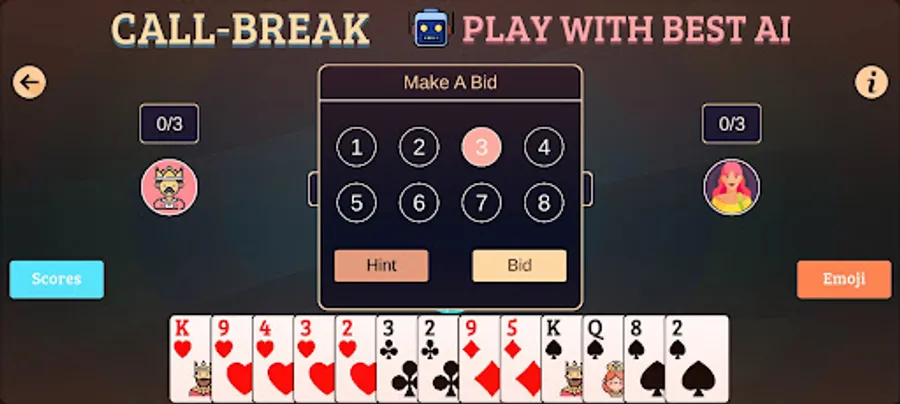 Callbreak is one of the most popular games in the India and Nepal region. It is also popular in the south Asia region. It is a variant of Spades card game. if you like to play spades then you will definitely like callbreak card game. Callbreak is a trick-taking card game played with a standard 52-card deck between four players. This is a five-round free card game. whoever will have the highest score after five rounds will declare the winner.
