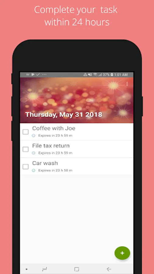 A simple to do list to manage tasks to be completed in 24 hours. The time cannot be extended or modified. You cannot delete any task. You can only mark tasks as complete. Otherwise, your task expires. Are you ready to challenge yourself?