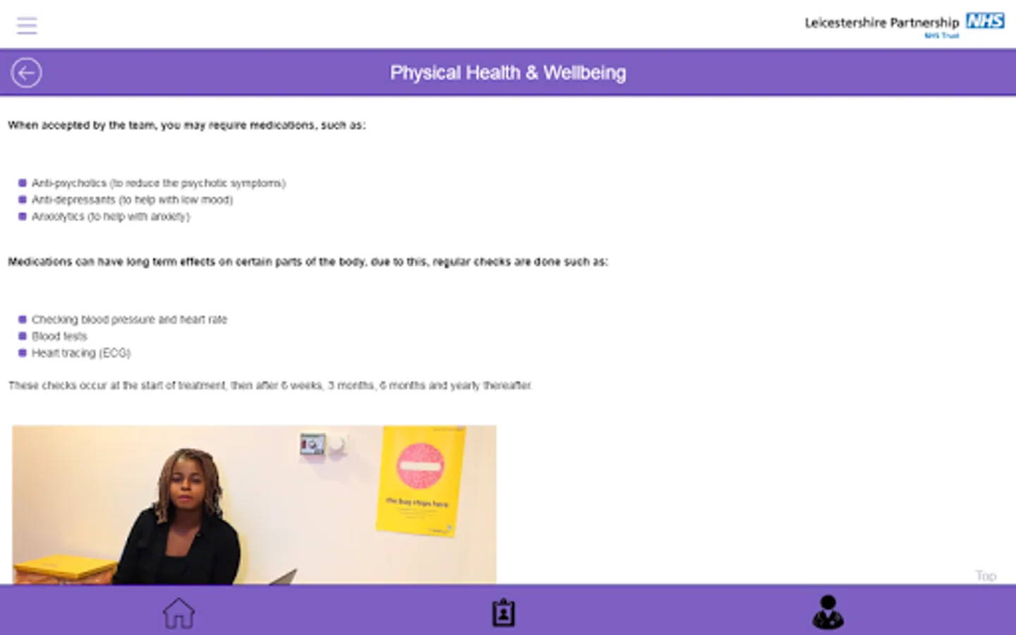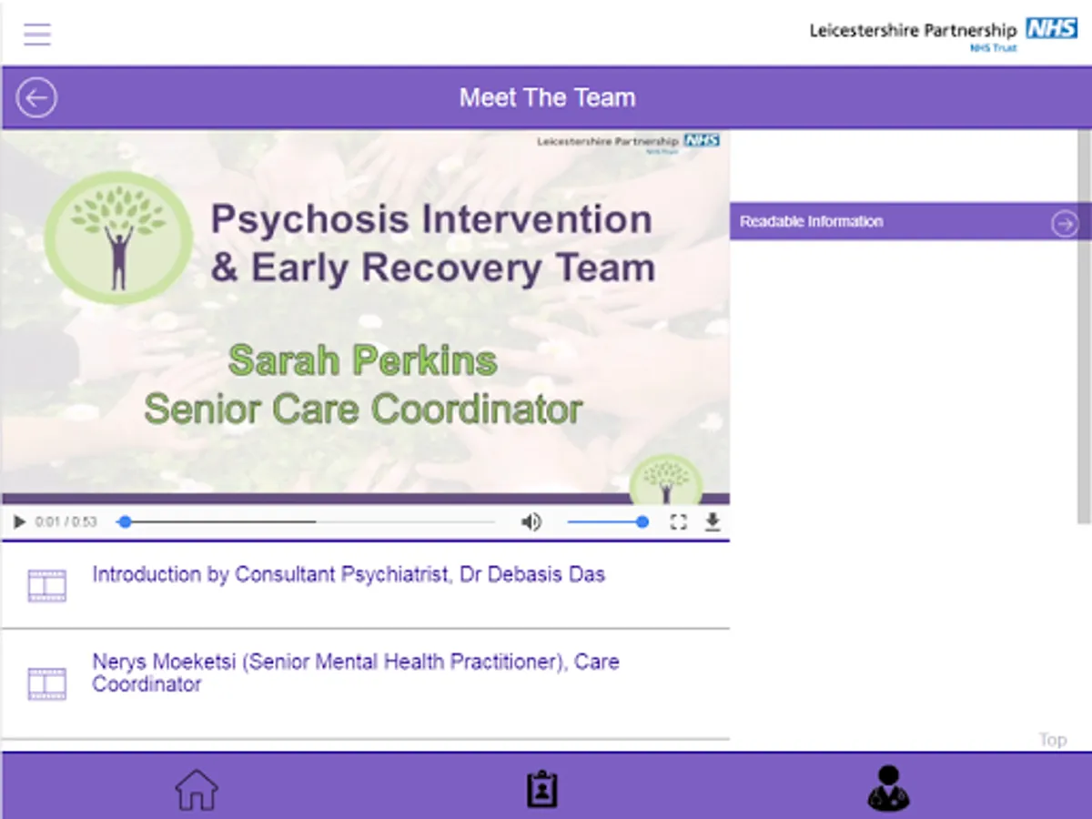 There are helpful videos about the roles and responsibilities of different professionals in the service and physical health monitoring of patients in the service. This can also be accessed as readable information.