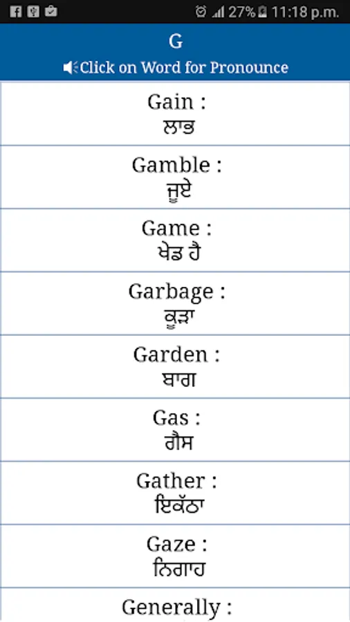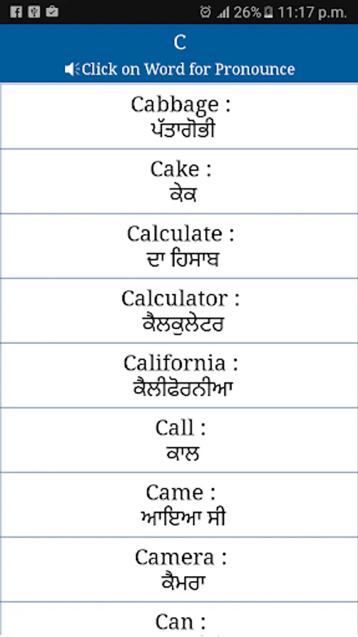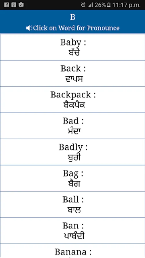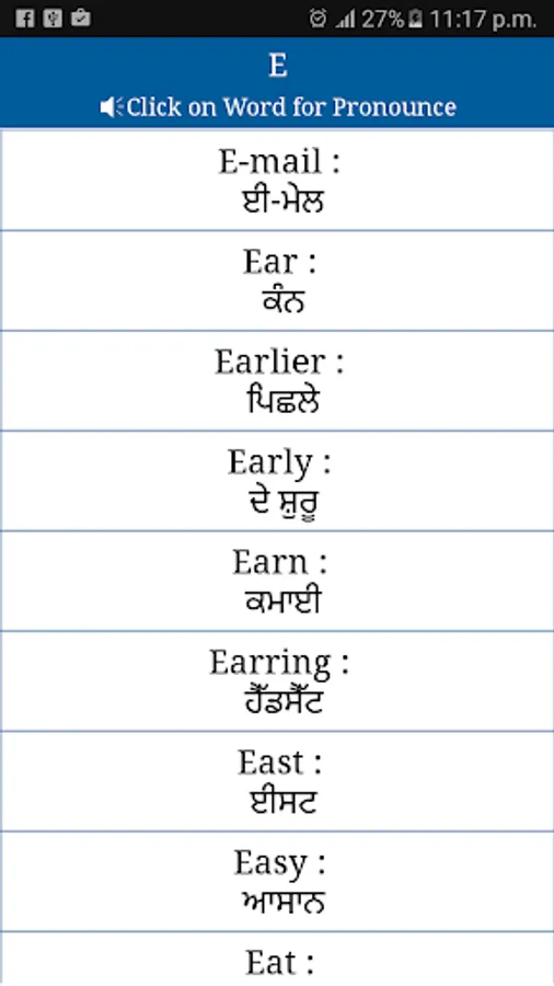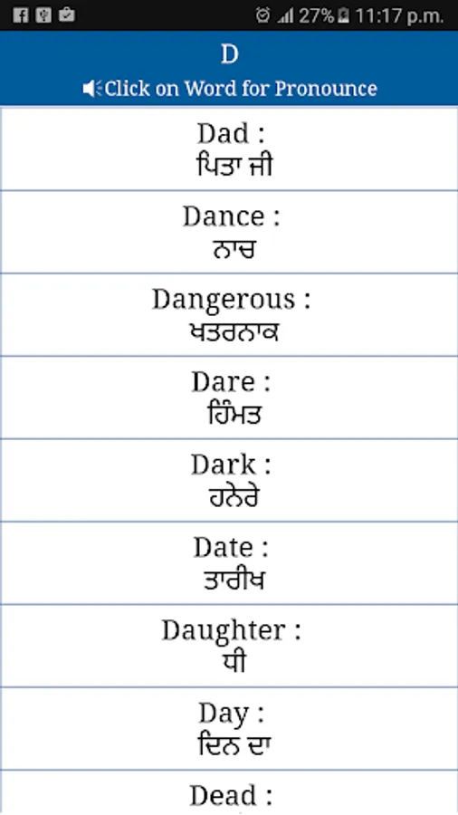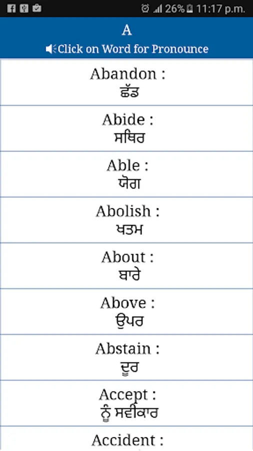 Common words English to Punjabi with pronounce or sound .This app help you to learn very common words, daily necessary words , must known English to Punjabi words , Vocabulary , Spoken English to Punjabi and Simple words .