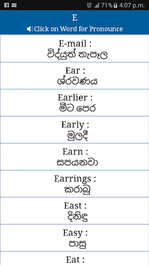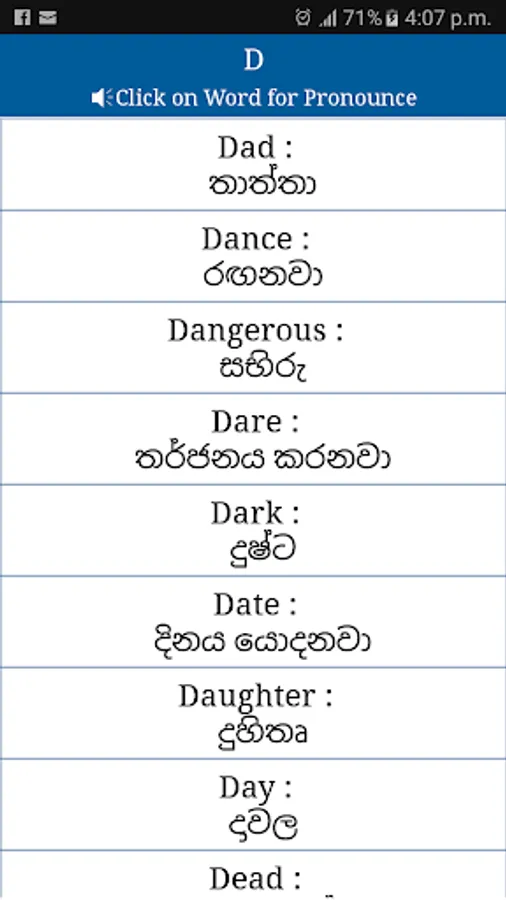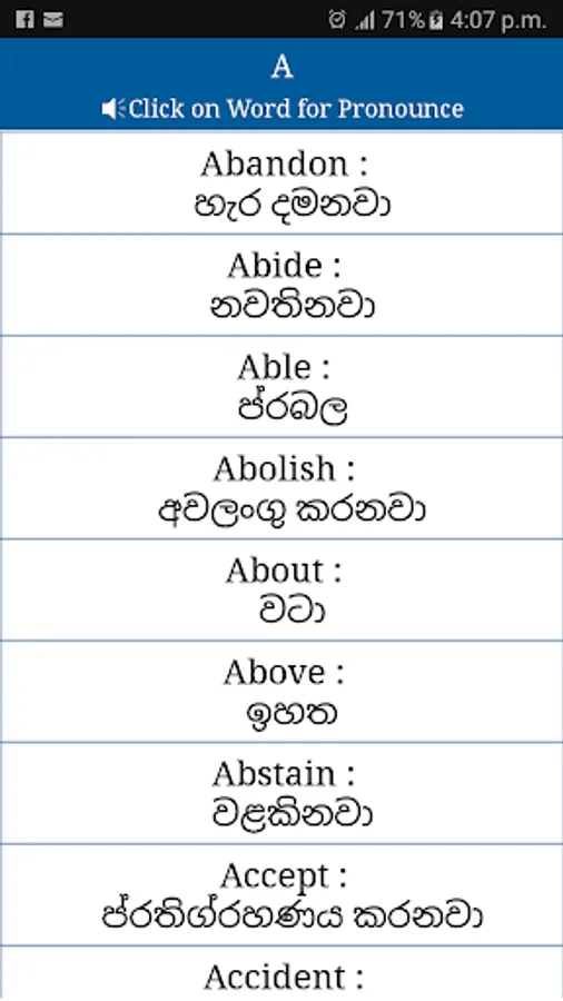 Common words English to Sinhala with pronounce or sound .This app help you to learn very common words, daily necessary words , must known English to Sinhala words , Vocabulary , Spoken English to Sinhala and Simple words .