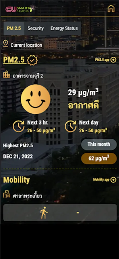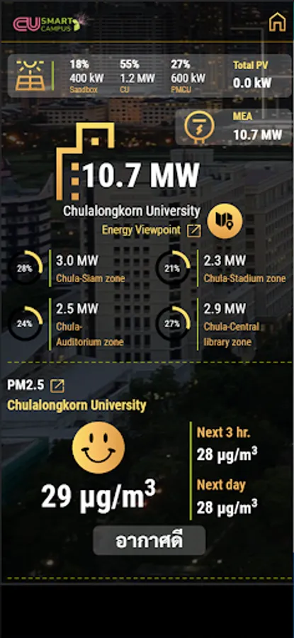 Smart Community is Overview dashboard that display all part of community such as energy monitoring(energy consumption, pv production), environment monitoring(PM2.5, indoor air quality),