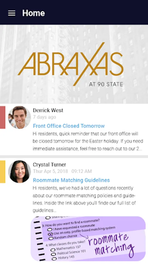 Our new App can enhance your experience at Abraxas at 90 State's through simple and effective communication.