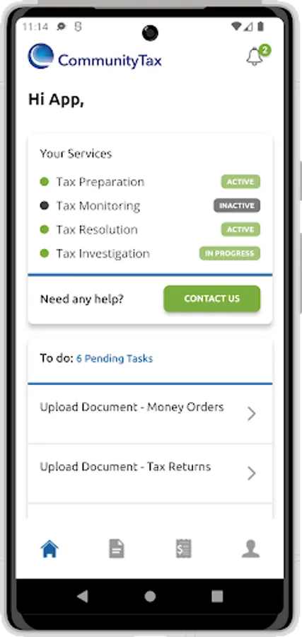 The Community Tax app will display the status of your Tax Resolution, Tax Preparation, or Tax Assurance Program services conveniently and quickly. You may also request contact directly from the app and a member of our team will reach out within 24 business hours (Monday-Friday 8am-5pm CST). It also allows you to check on your payment schedules to Community Tax and manage your preferred payment method directly from the app.