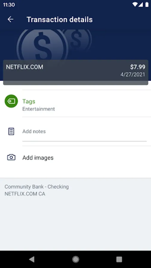 - Keep your transactions organized by allowing you to add tags, notes and photos of receipts and checks.