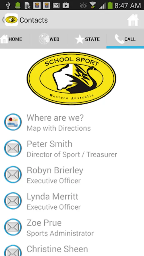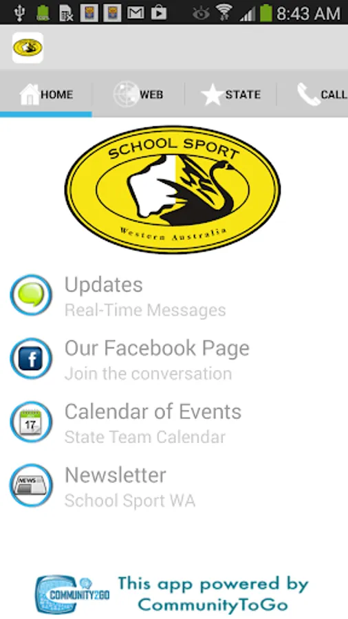 This app is for the community of School Sports WA. It allows easy access to often sought information such as contacts, newsletter and state team information. School Sport WA can keep its users up to date with real time push notifications, and users can update their calendars with events from the app calendar.