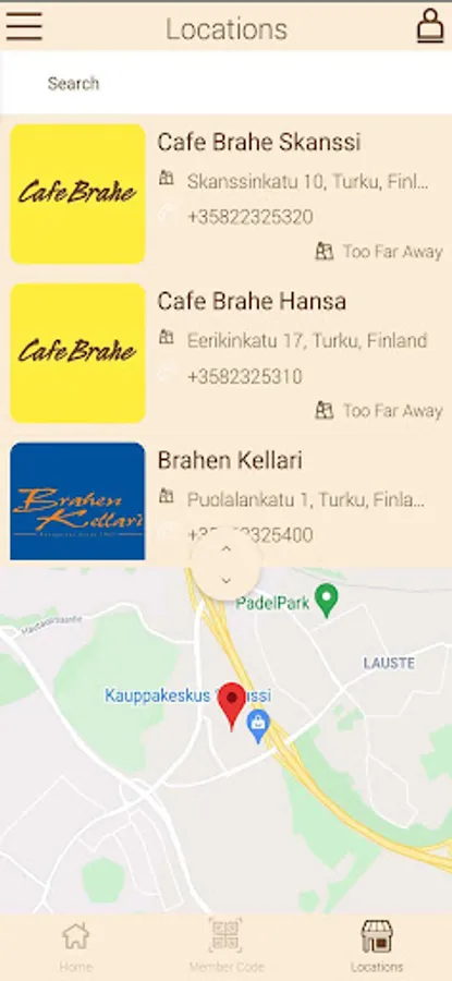 Sovelluksella voit personoida Cafe Brahe Kahvilat ja osallistuvat ravintolat (lähiaikoina Brahen Kellari):