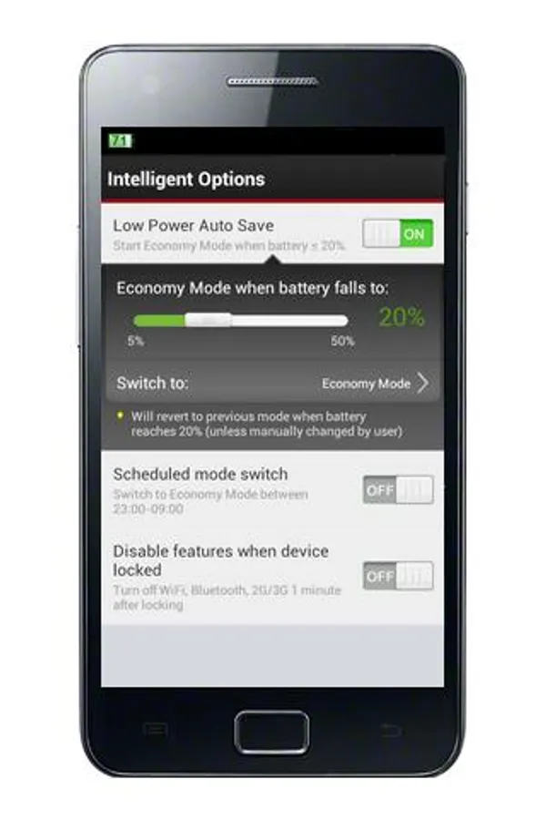 * Intelligent Save - Automatically switches from normal mode to economy modes when the battery power reaches low levels