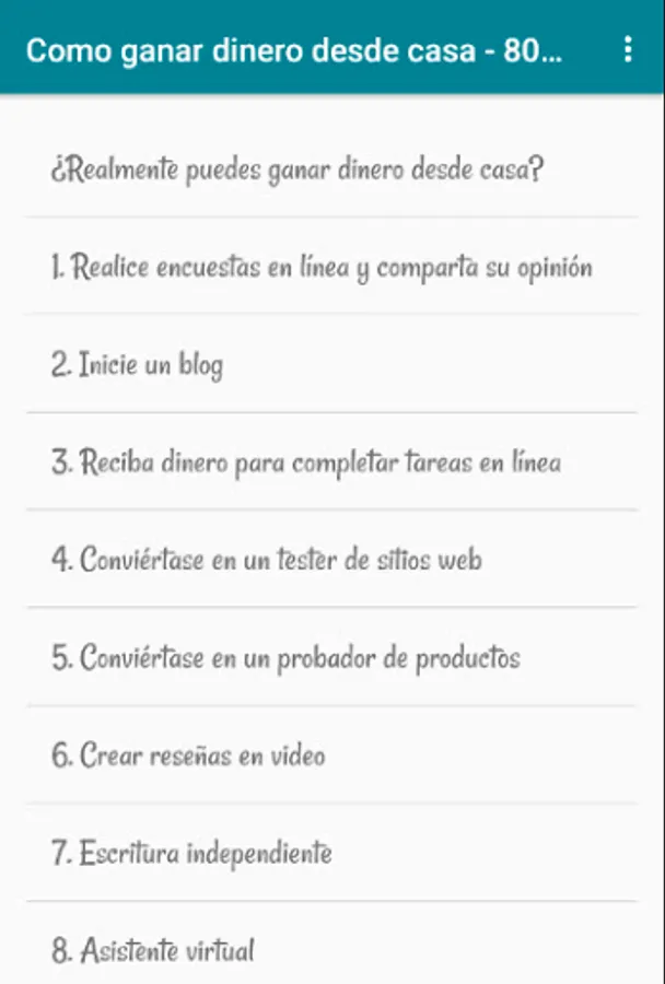 In this App you will find 80 ways to know how to earn money from home, in a simple, easy, fast way ...