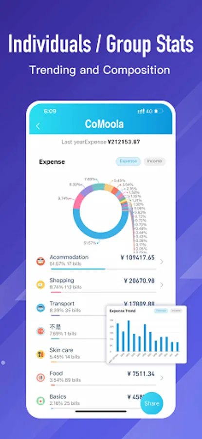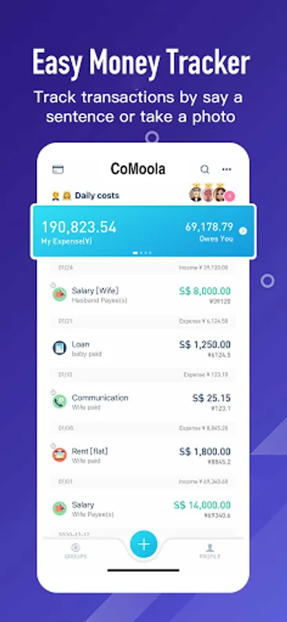Support splitting, share, percentage, specific etc. Keep track of shared income and expenses, balances, and who owes who.