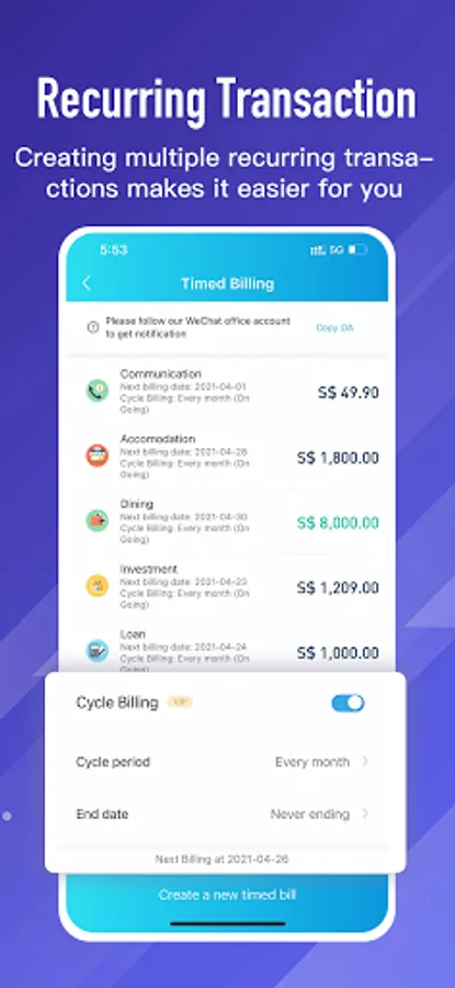 Set up a fixed income and expenditure immediately for the periodical occurrence. Every time when the time comes, the system will automatically record a bill for you, which is suitable for fixed salary or deductions such as rent (mortgage), insurance, fixed fund investment, revolving credit card etc.
