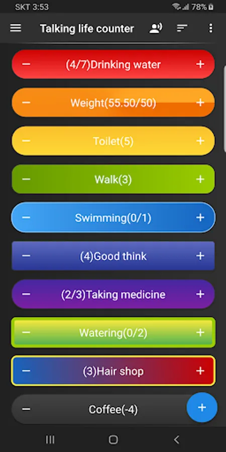 Drinking water, counting, exercise, weight(decimal), fishing(count fish), swimming, watering, habit, medicine, hair shop, feces, foreign language (English, Chinese characters, Japanese, etc.) Numbers study, stretching, blinking, feeding, snacks, pills , Game points, bad words, good think, good ideas, prayers, d day, diet, calorie etc.