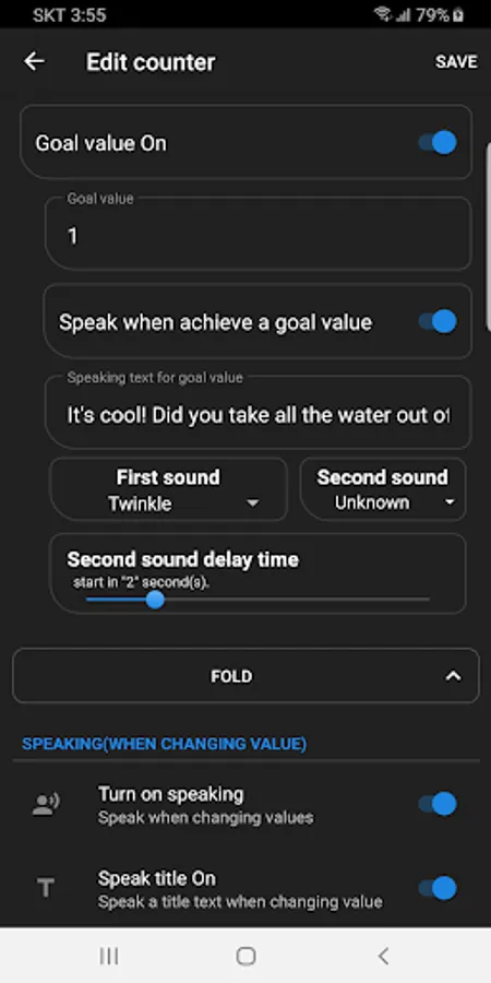 - When reaching the goal, the alarm popup shows and reads the message with the first bell, and the second bell rings.