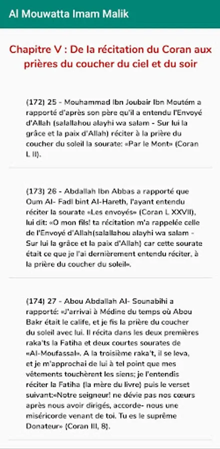 Al mouwatta is an Islamic work constituting the basis of the jurisprudence of the Malikite school. Considered to be one of the oldest existing sources of Hadiths, the different hadiths are classified by subject: Prayer, ablution, Ramadan, Hajj, travel, Quran, zakat, marriage, sales, wills , alms, etc ....