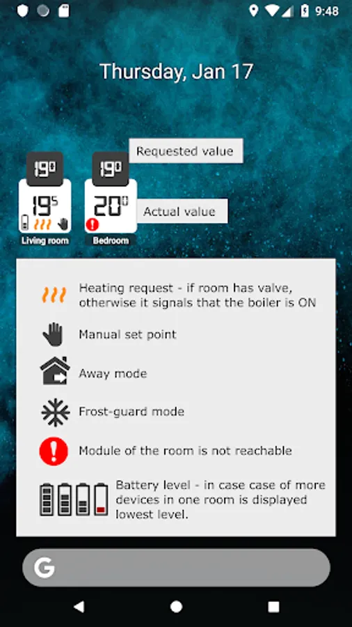 On widget is displayed information about required and actual temperature, manual setpoint flag, heating request or issue with connection to the unit.
