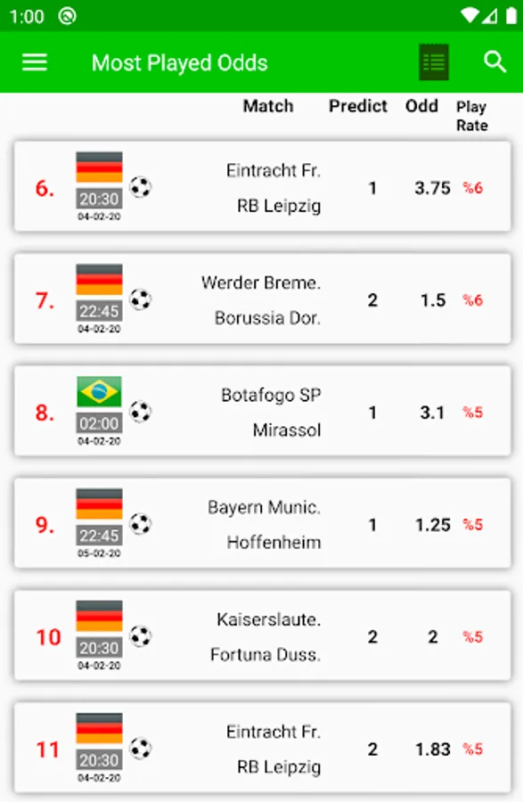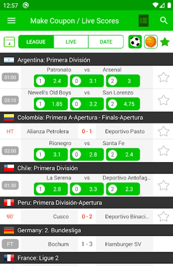 • Constantly updated pregame and in-play / live betting odds ( Match Result , Double Chance , Over / Under , 3Way Handicap , Over / Under 1st Half , HT / FT Double , Draw No Bet , 1st Half Result , Total Home / Away , Correct Score )