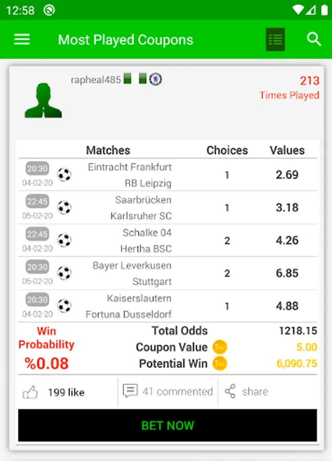 • Create betting coupons and bet for free as well as like, comment and share coupons of tipsters from all around the world.