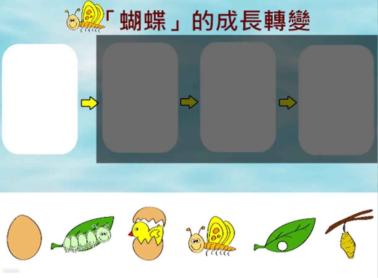 而且,系統會顯示更多非答案的選項,要求學生能多個選項中選出正確選項,並正確排列出動物的成長過程。
