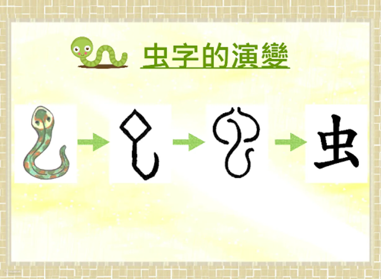 - 以動畫形式顯示不同圖片,辨識「虫」字的演變過程