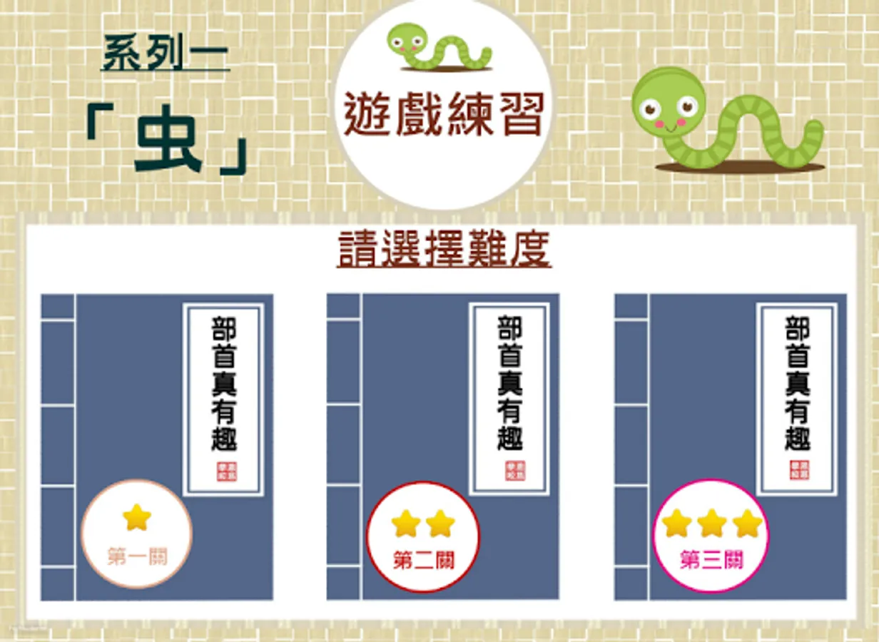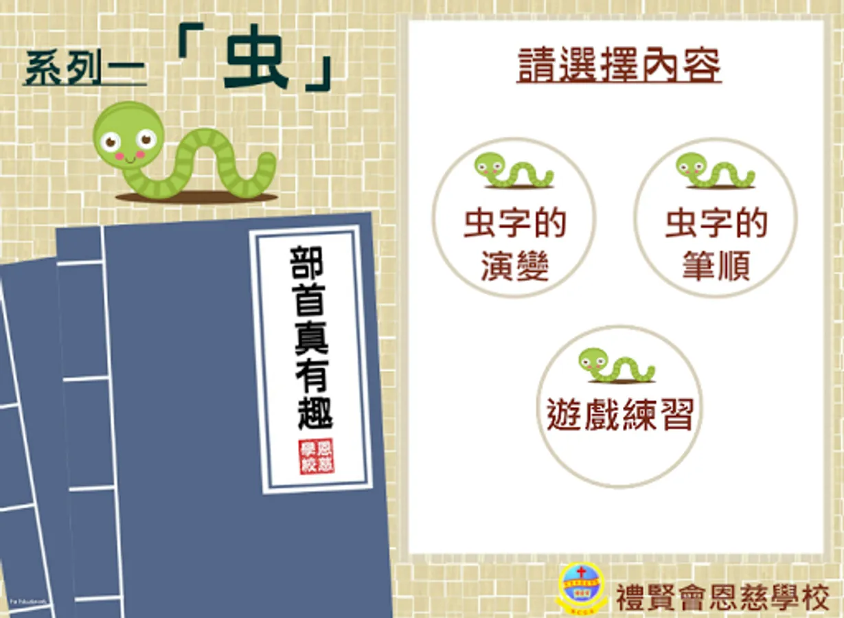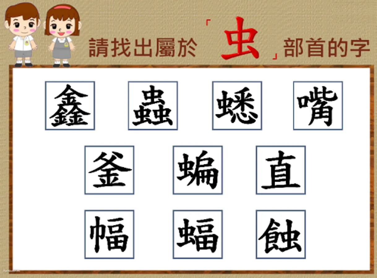 - 練習提供不同的字詞,學生需選出屬於「虫」部首的字