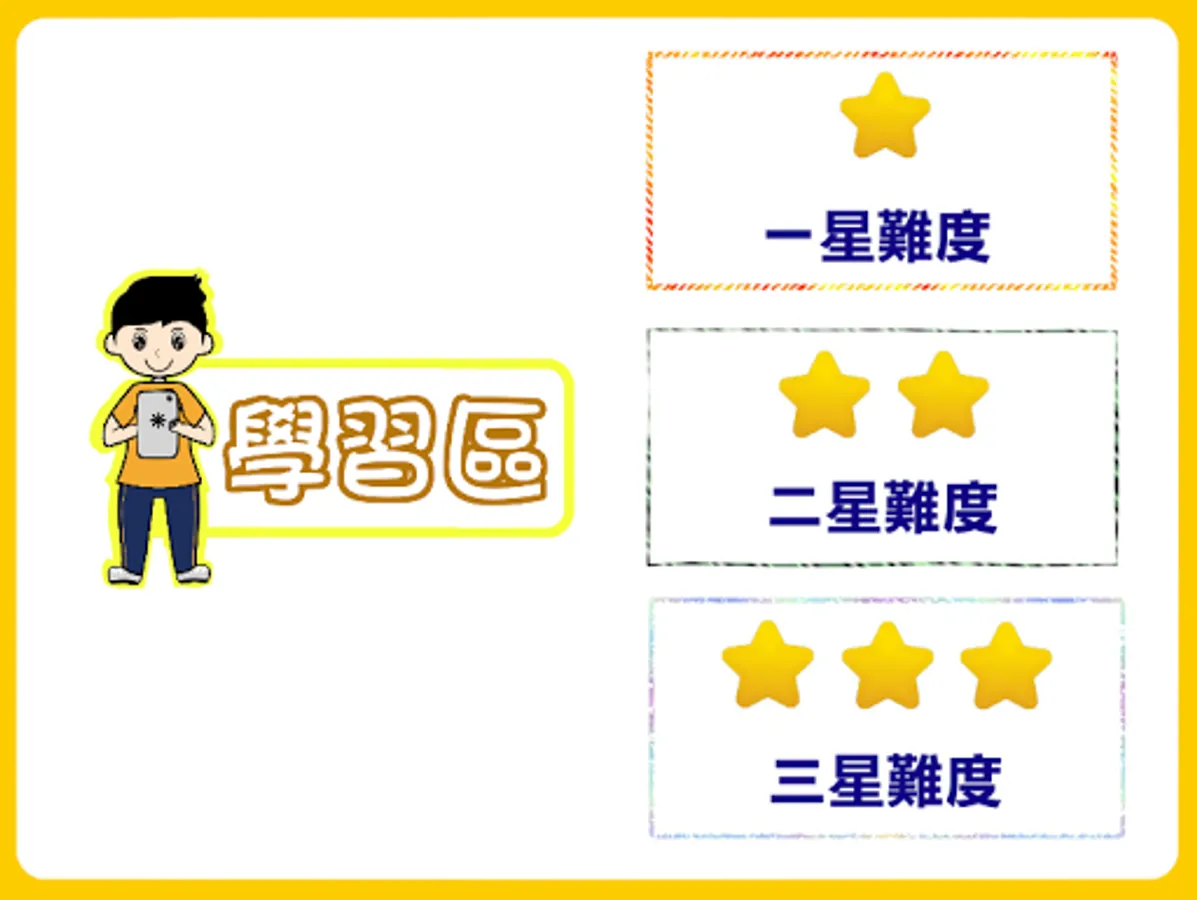 - 為加強照顧學生多樣性,練習將分為三種難度,分別是一星難度、二星難度及三星難度