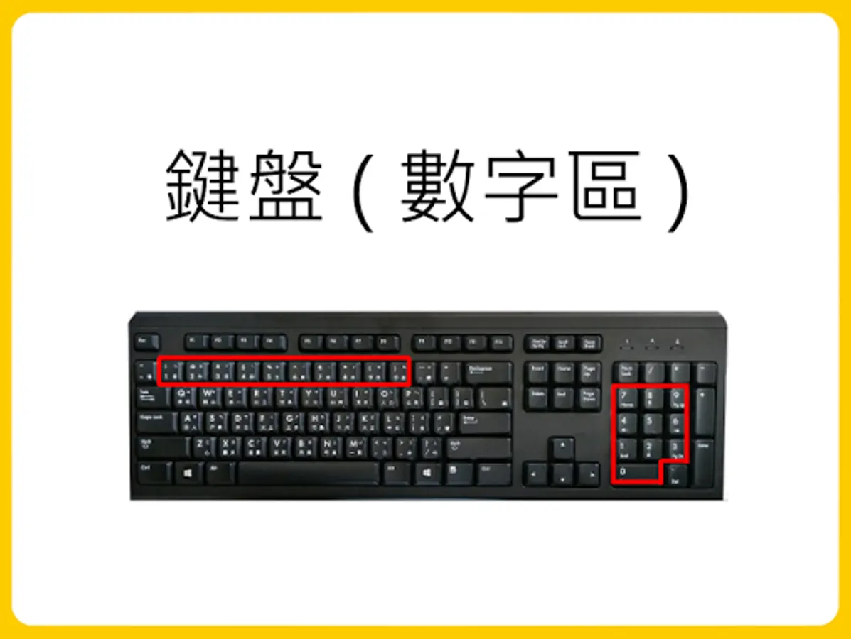1) 鍵盤左方為打字區、鍵盤右方為數字區