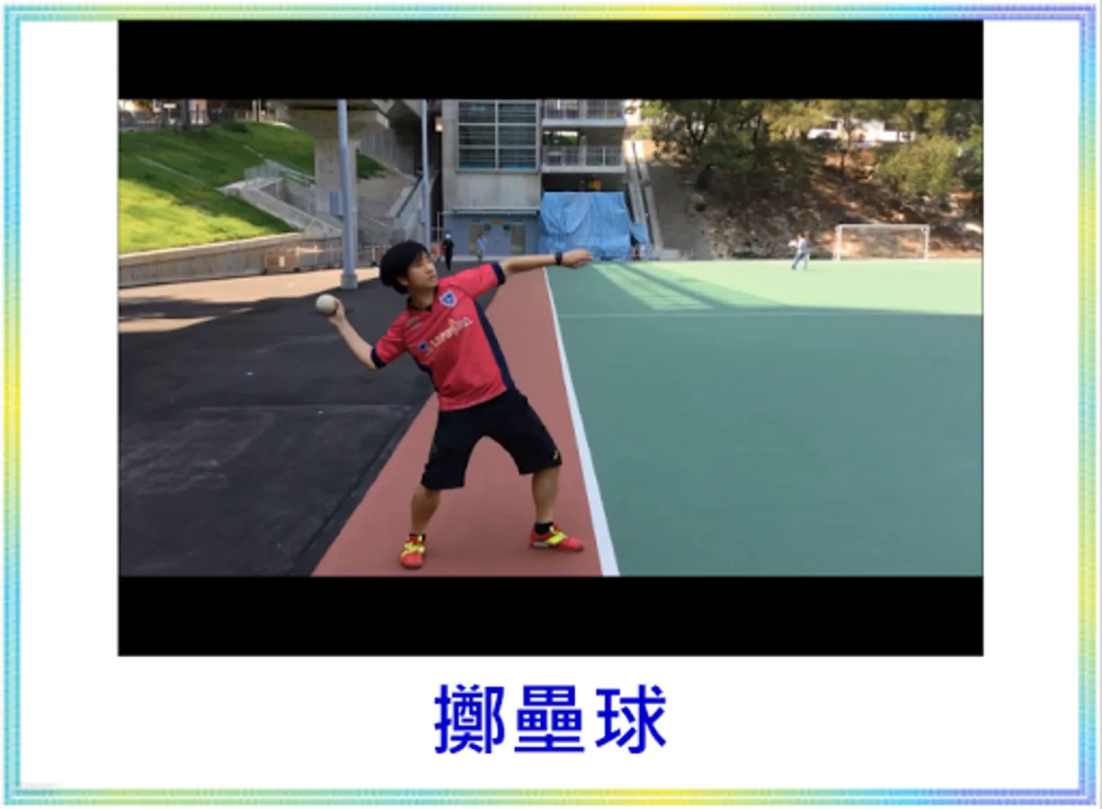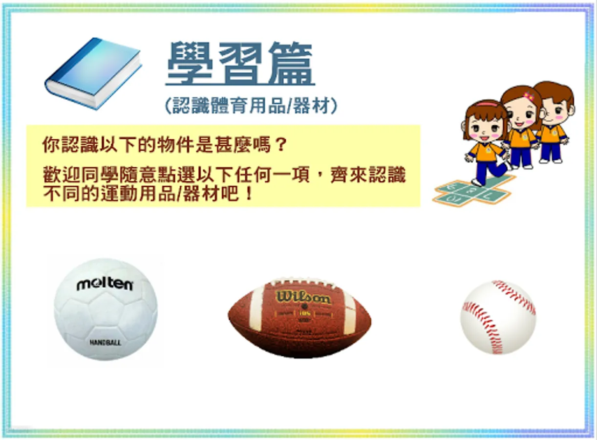 -學生可點選任何體育用品/器材,然後顯示圖片及短片,學生可重覆播放及溫習。