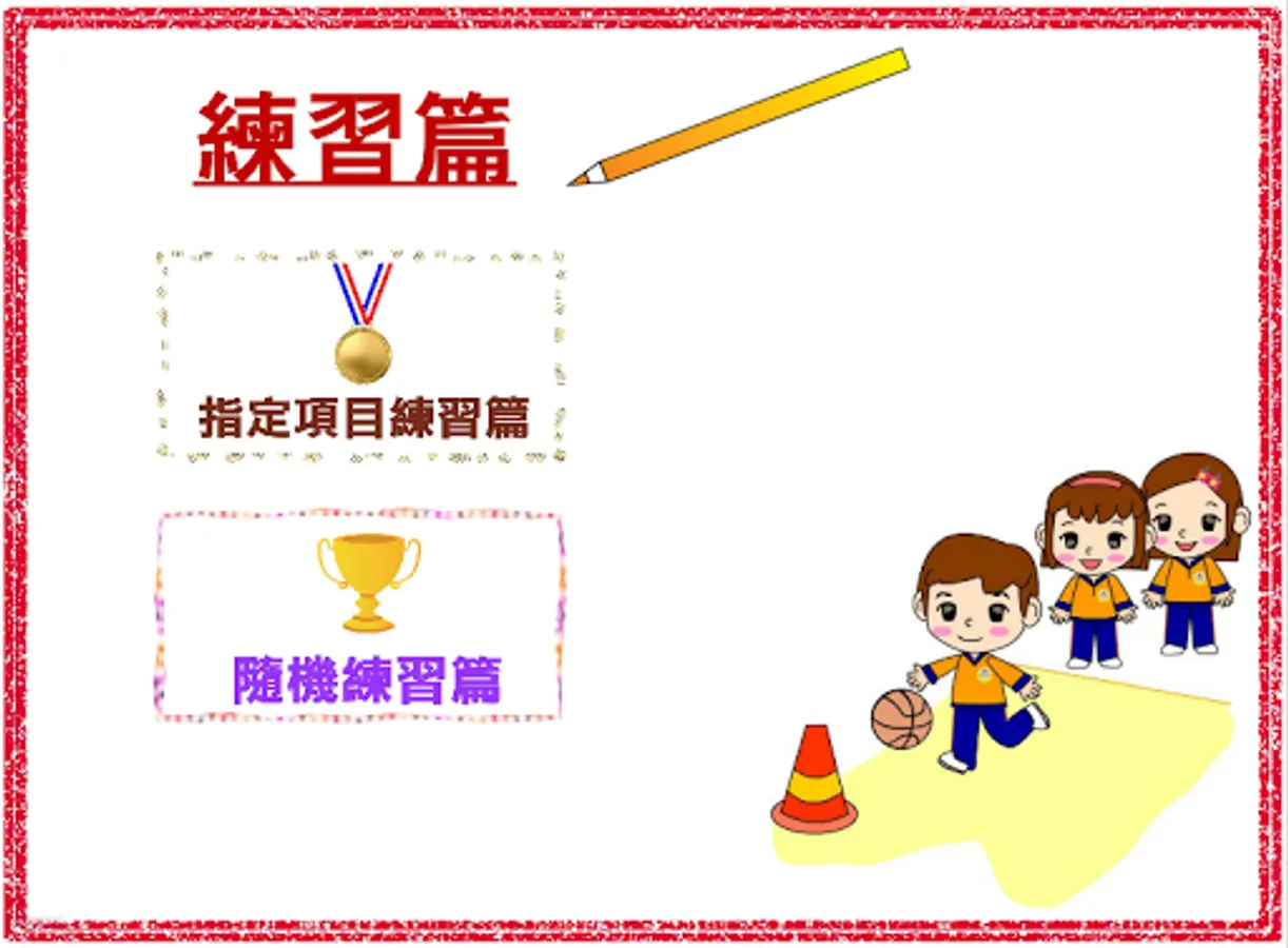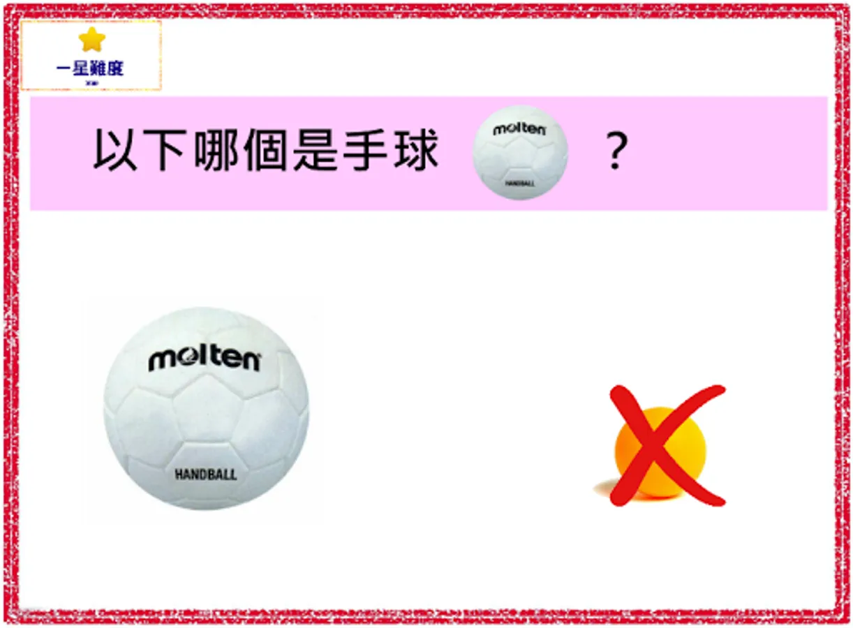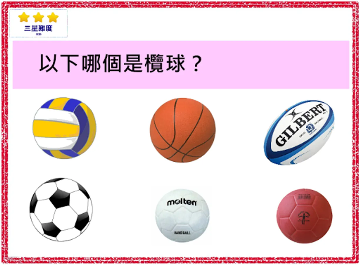 - 系統將隨機考問學生不同的體育用品,而非單一指定項目,如:第一題(籃球)、第二題(足球)等等