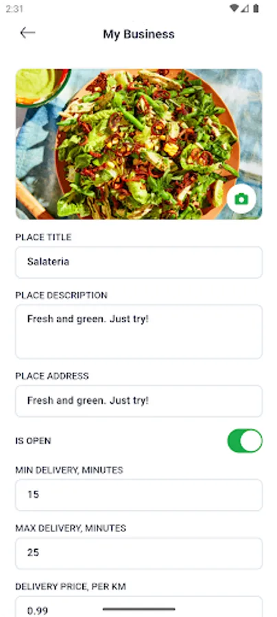 Place Management - administrator can see their restaurant description and edit place information - image, name, description, hide (close) restaurant, working hours, and delivery details.