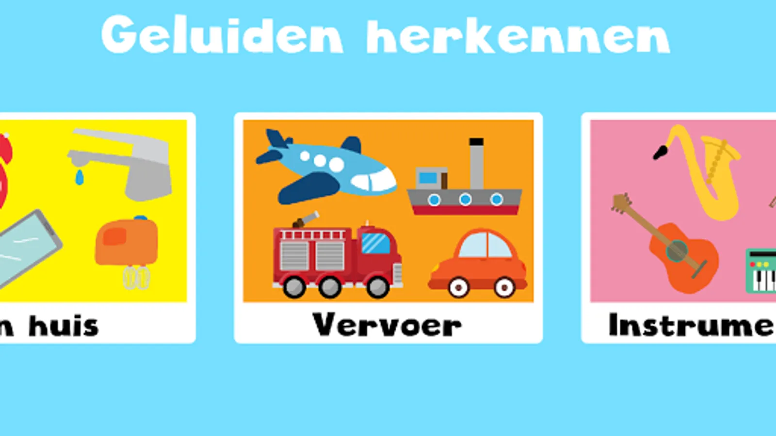 The application Recognizing sounds contains various sounds for children to practice. The sounds are subdivided into five categories, and each category contains 12 sounds. The categories are:
