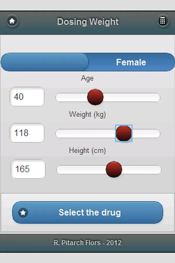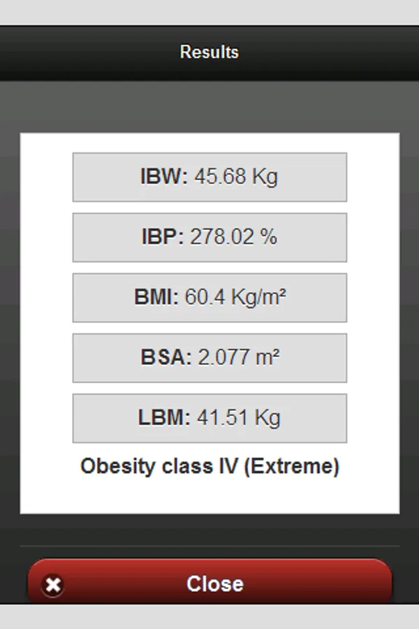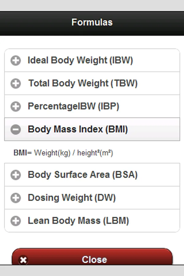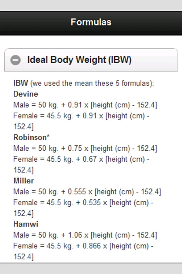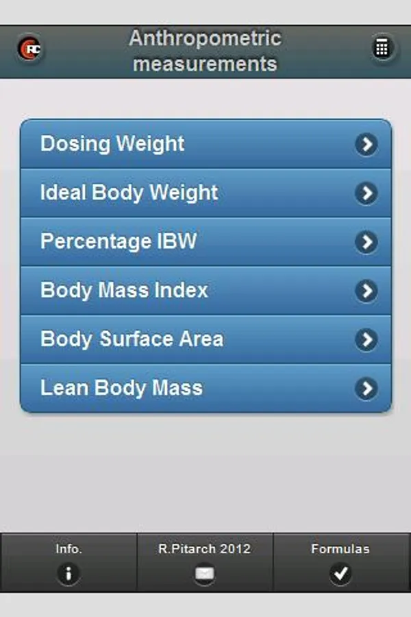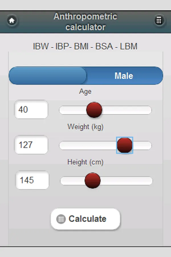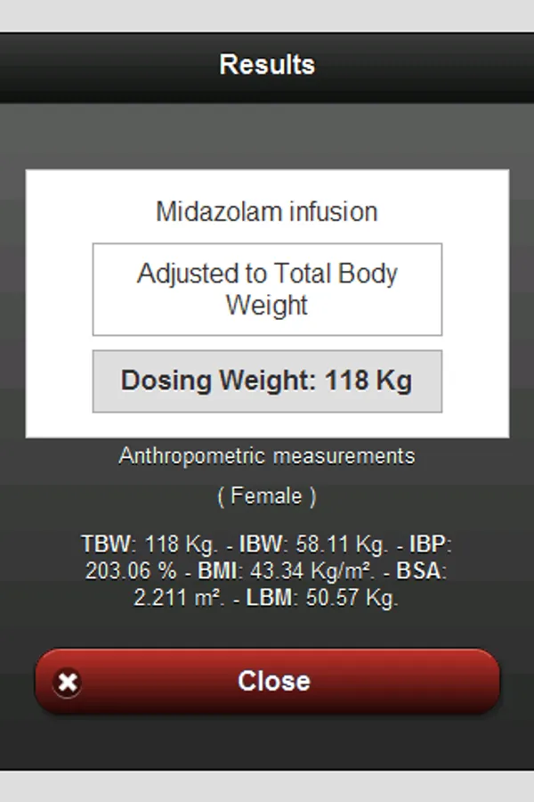 Content (calculations): Dosing weight for different drug dosage (antiarrhythmic, sedatives, electrolytes, antibiotics, muscle relaxants, heparins, ....) Ideal body weight, percentage of ideal weight, body mass index, body surface area, lean body mass, total body water.