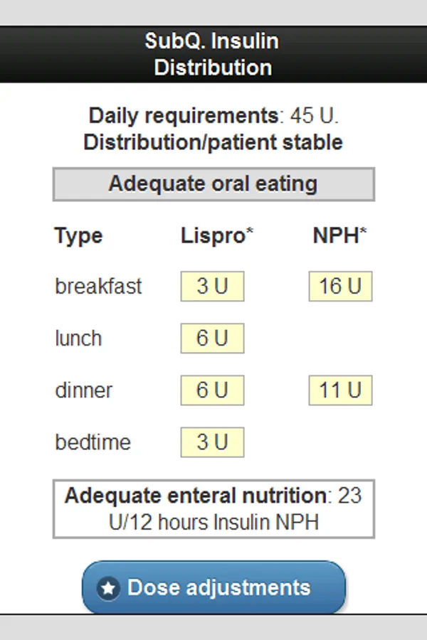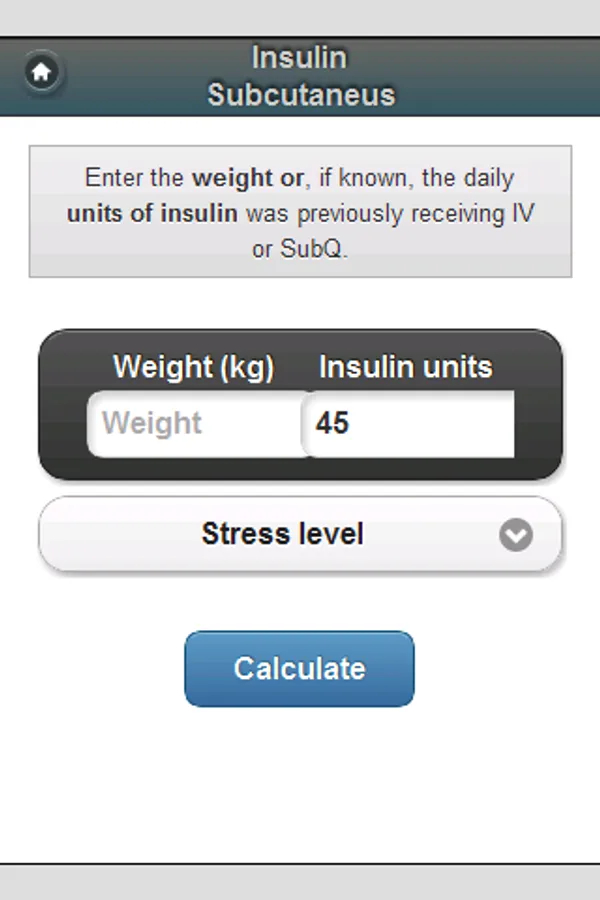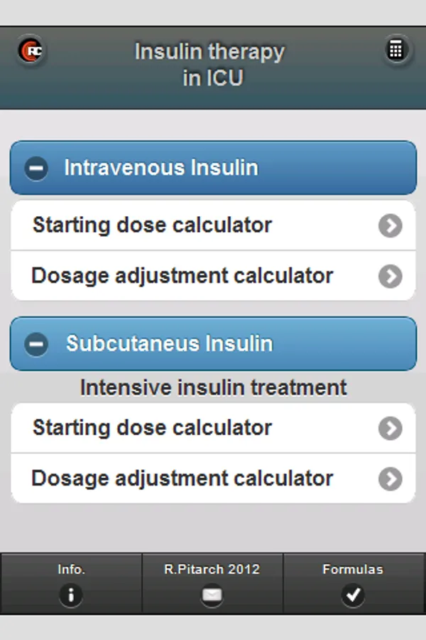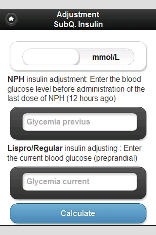 In this application are calculated insulin requirements needed by hospitalized patients with hyperglycemia. We propose two therapeutic regimens and different routes of administration. Recommended intravenous insulin therapy in critical illness (ICU), and subcutaneous intensive regimen in stable patients who can tolerate oral intake or enteral nutrition. For the preparation of these calculators I algorithm based on clinical trial NICE-SUGAR,arm of the study that showed reduced mortality in ICU patients if blood glucose levels were maintained between 140-180 mg/dl [7,7 to 10 mmol/L] . In stable patients have followed the recommendations classic show that subcutaneous intensive insulin regimens, with the aim of approaching normoglycemia, improves prognosis of diabetic and nondiabetic patients. In these patients is recommended to maintain blood glucose preprandrial level between 90-130 mg/dl [5 to 7,2 mmol/L].