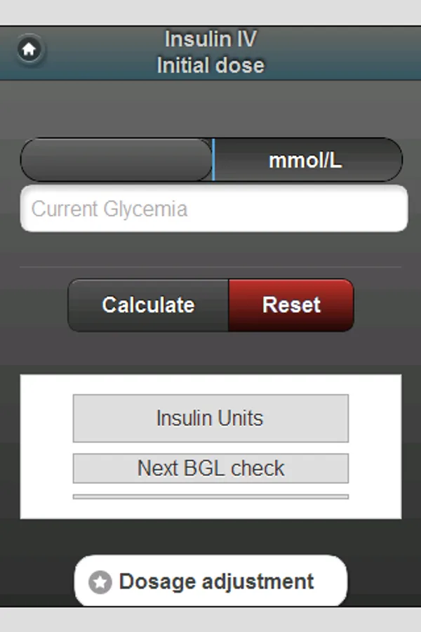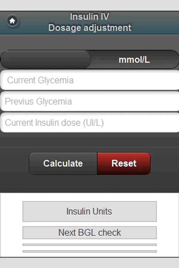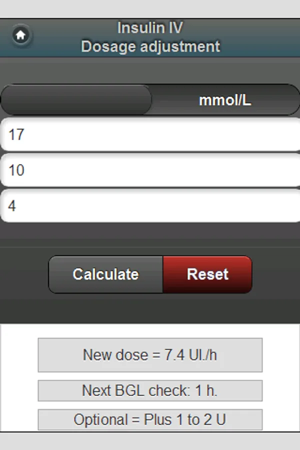 Calculations can be performed for blood glucose values measured in mg/dl or mmol/L. The insulin dose adjustment of intravenous takes into account the upward or downward produced in the last hour of treatment and amount of insulin responsible for this variation. Attached literature and formulas used in the calculation and dose adjustment.