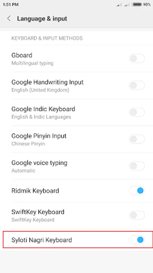 3. Enable Syloti Nagri Keyboard > Main Menu > Select Syloti Nagri Keyboard