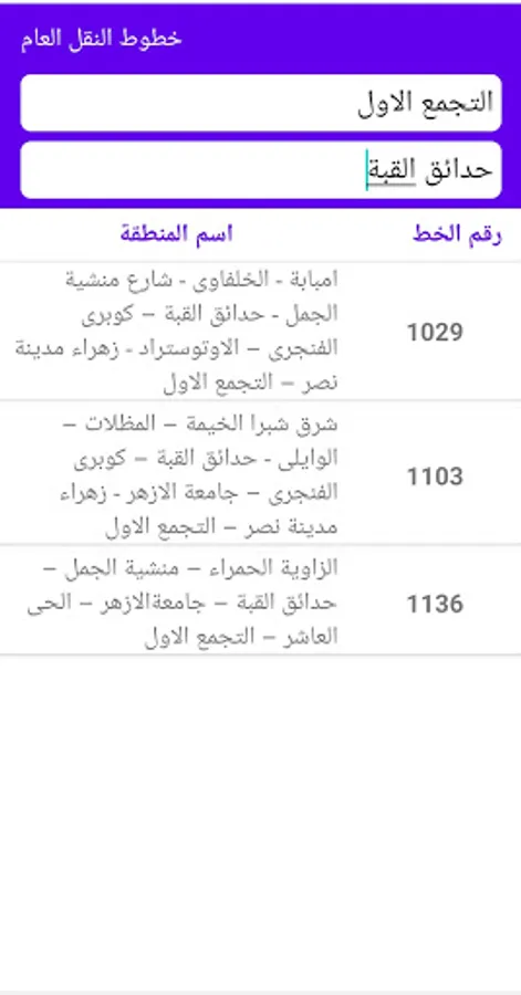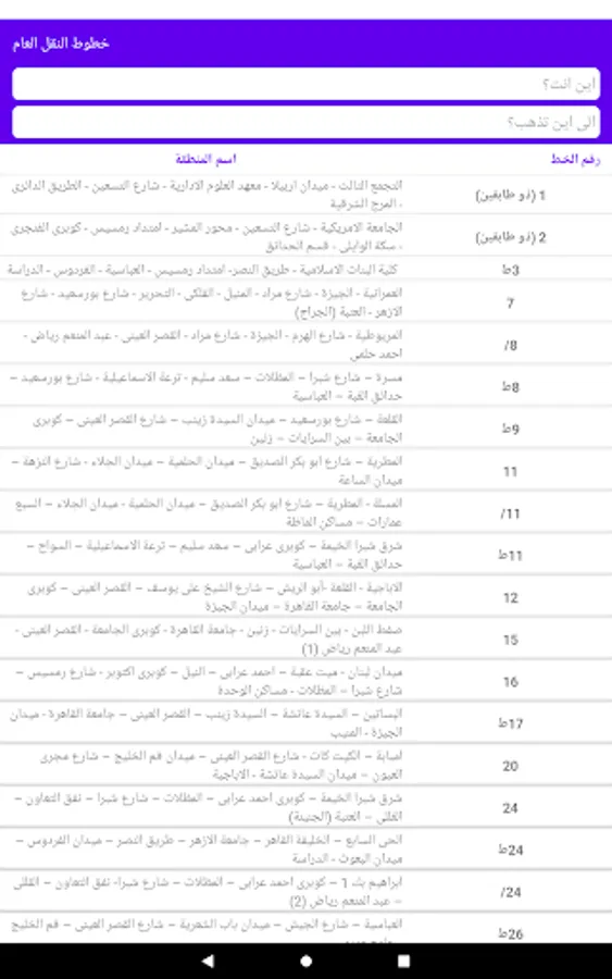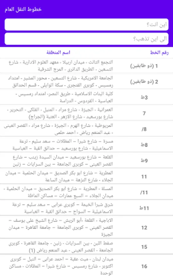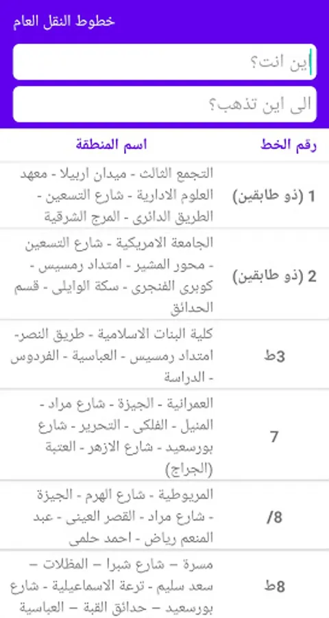 The application is for knowing the lines of public transport buses. Once you choose the area in which you are and the area you will go to, the application will show you the lines and numbers of buses that are appropriate for you