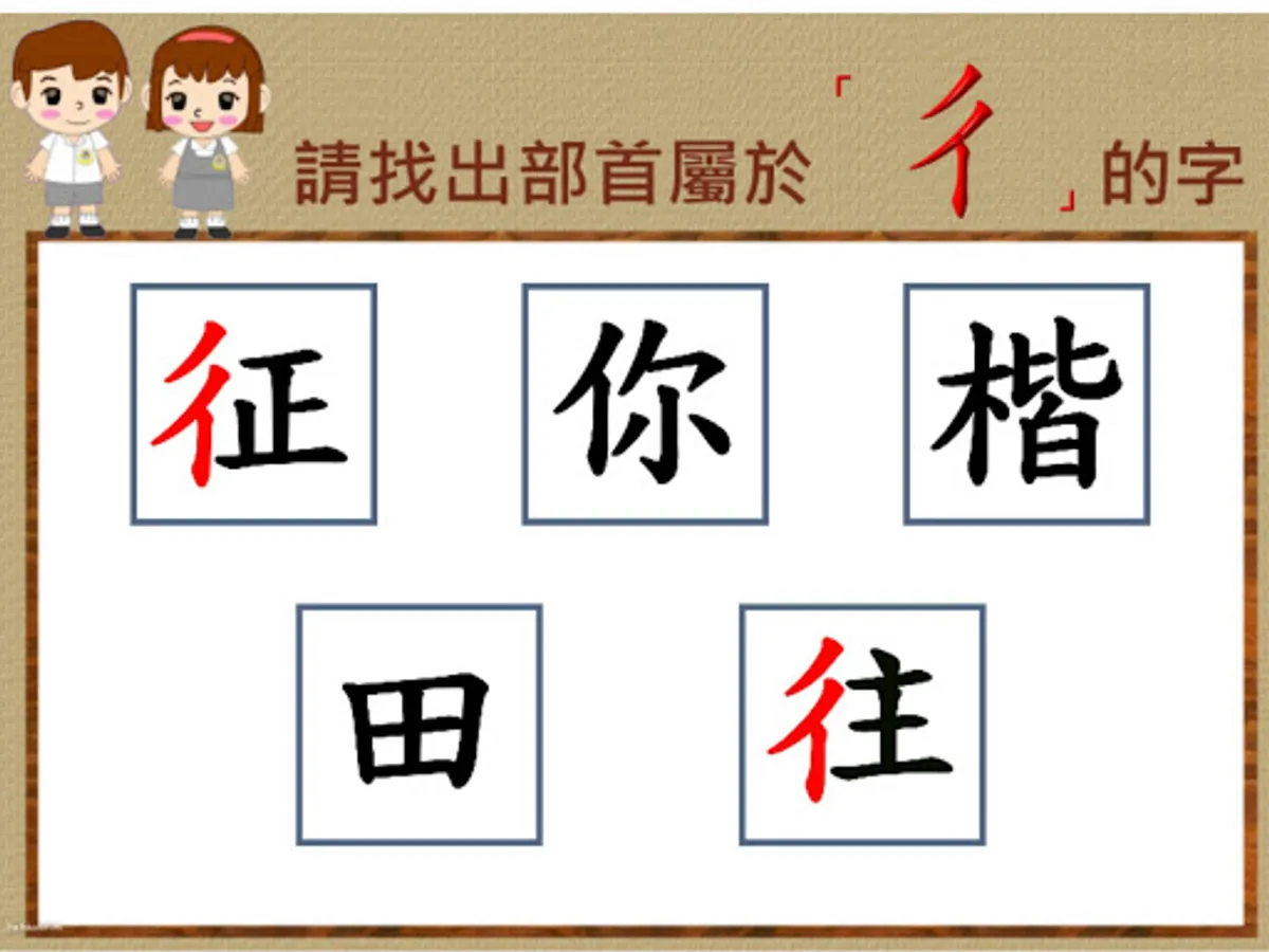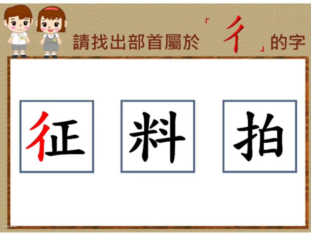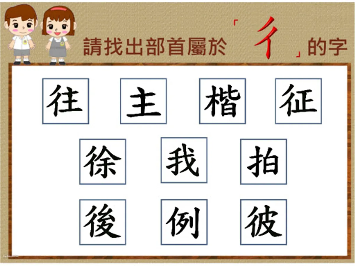 - 練習提供不同的字詞,學生需選出屬於「彳」部首的字