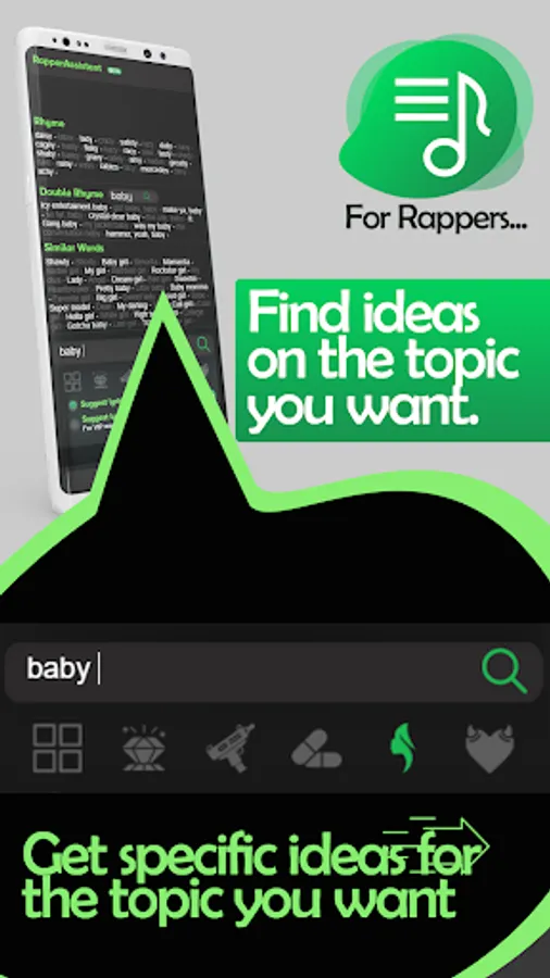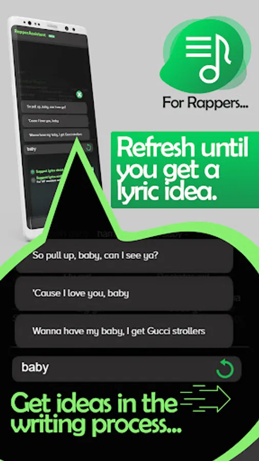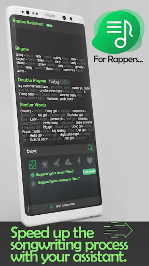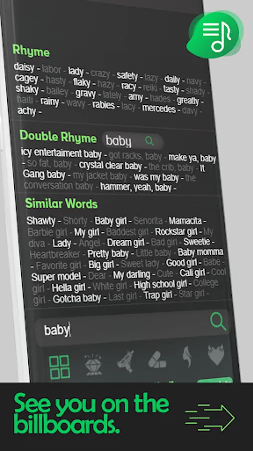 Just say which word you want to write lyrics about. Rappad will offer you suggestions from thousands of lyrics. They're all rap lyrics. So you can get ideas and write your lyrics quickly.