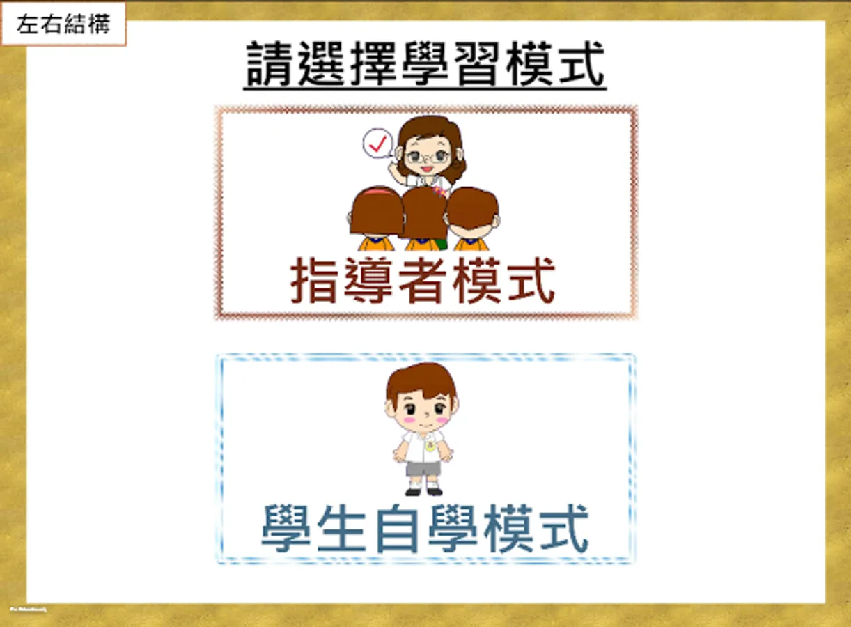- 「學生自學模式」:指導者先按學生的能力選擇提示方式,然後讓學生自行完成共七至八條的部件組合題目。