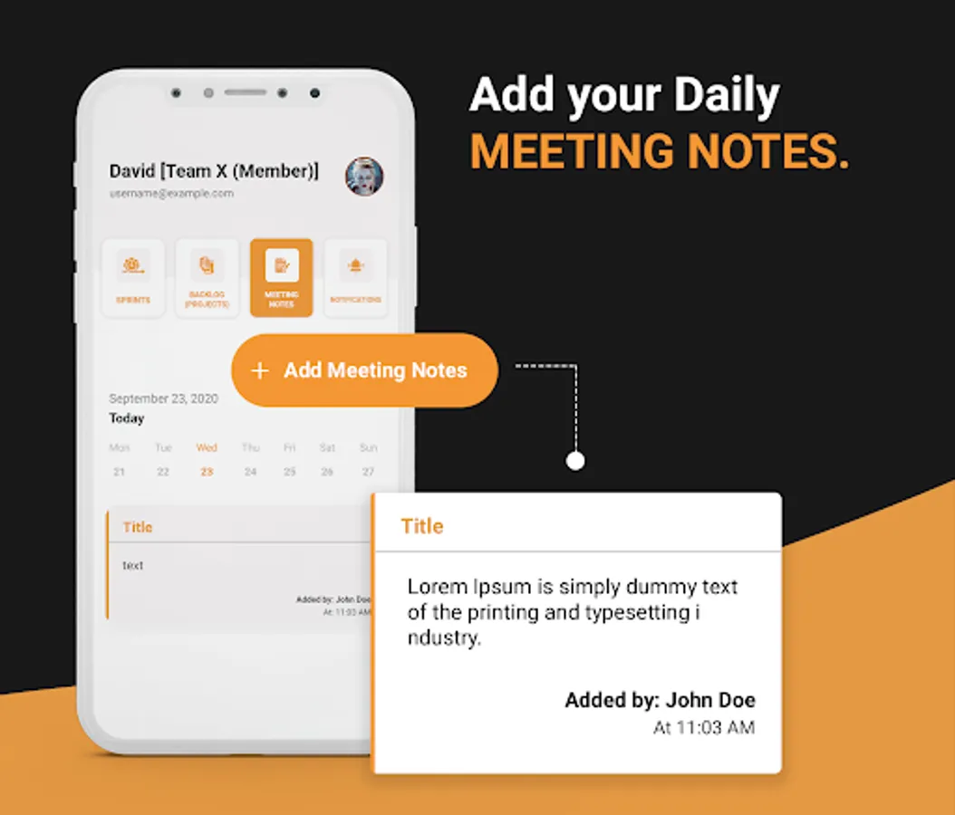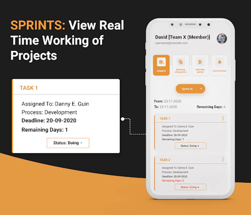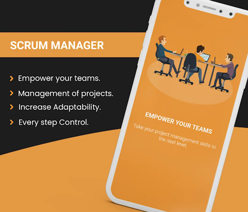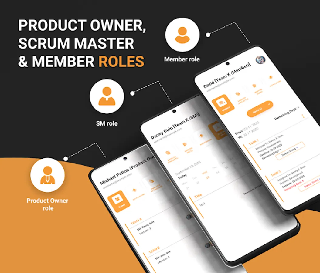 Owner (PO), HR, CEO and the company participants. Scrum Management app provides different