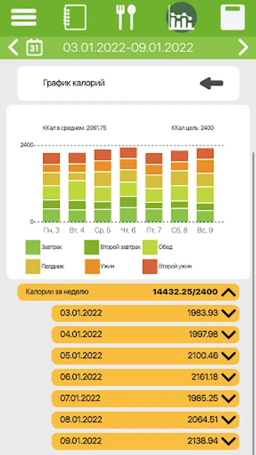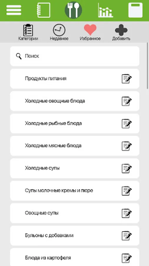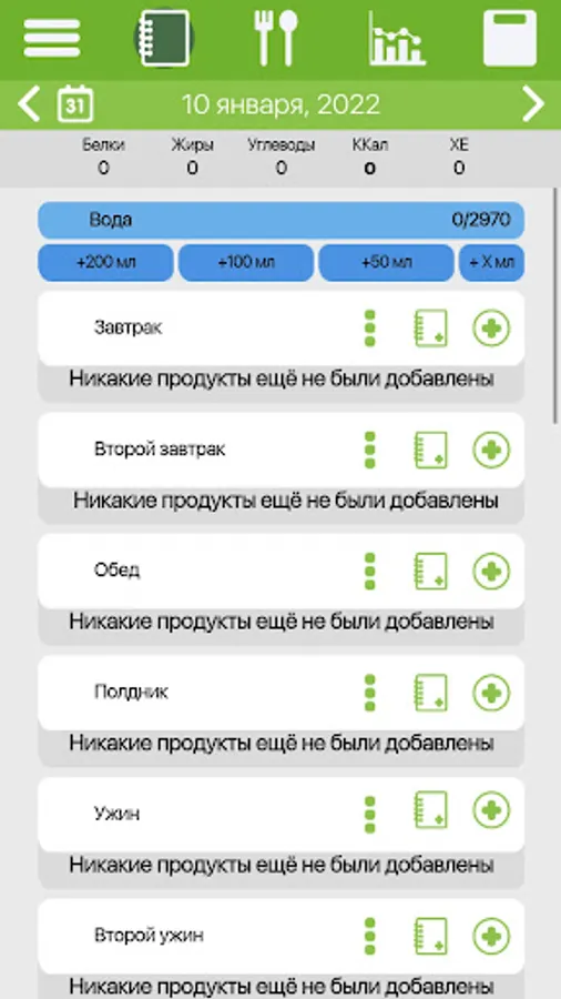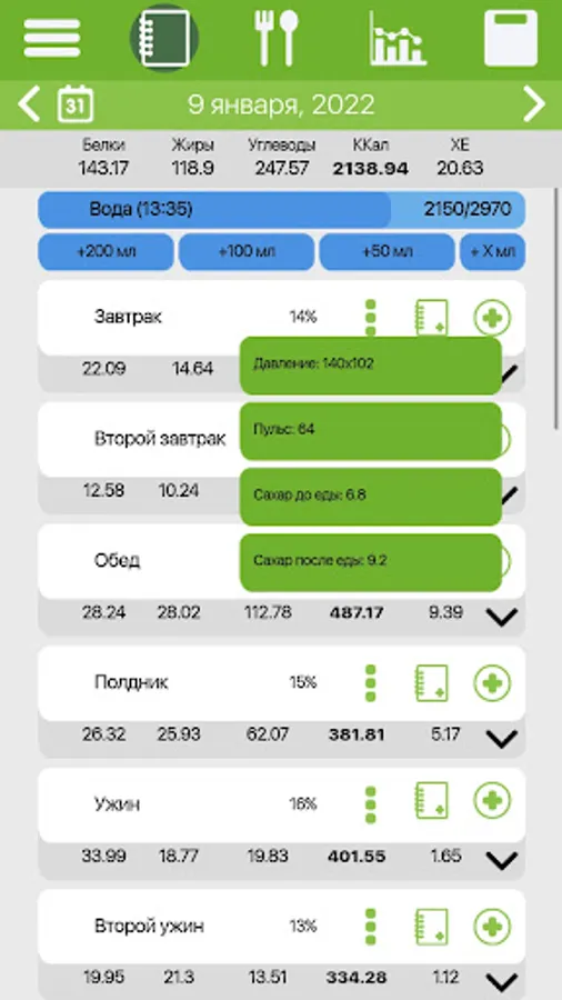 A calculator of calories, bju, vitamins and minerals is used to conveniently calculate the consumed substances. At the initial start-up, depending on the weight, a calculation of 30 kcal per 1 kg of weight is used. A calculator that uses bju, vitamins and minerals, fiber, sugar, fats and cholesterol will be easy to use. An open architecture was made for everyone - fix what you don't like, add any foods and recipes that you think are necessary to the food calculator.