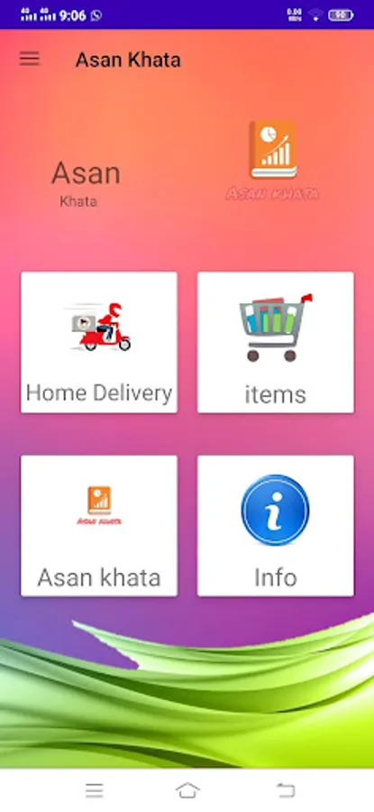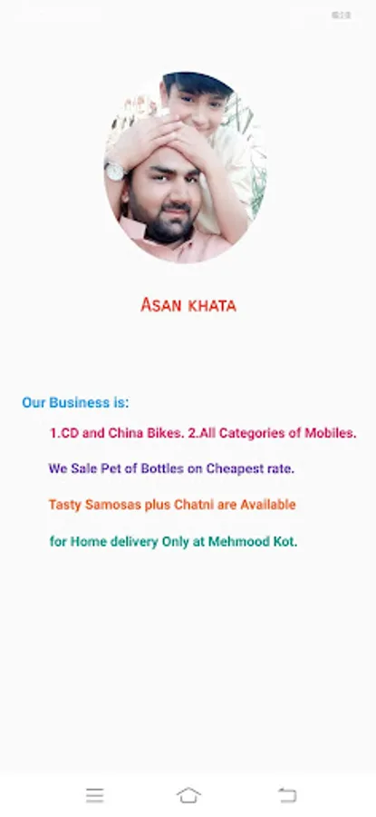 As per app name(Asan Khata), it is very simple, useful app regarding different types of business at the same plate farm. In this app, user can easily identify different types of items & picture of different things are also available in this app. Actually, Asan meaning is “easy”. User can easily select Urdu or English language as per his desire. Also this app is related with home delivery of items, user can contact with owner of app through phone number & as well as through gmail. Also in this app, there is Motor Cycle leasing facility(scheme), picture of owner is too available. There is beautiful splash screen for providing user-friendly environment. In this app, there is button of “Info” . In this button there is detail mentioned that it is related with different type of business(we can say multi-business work at the same plate farm).