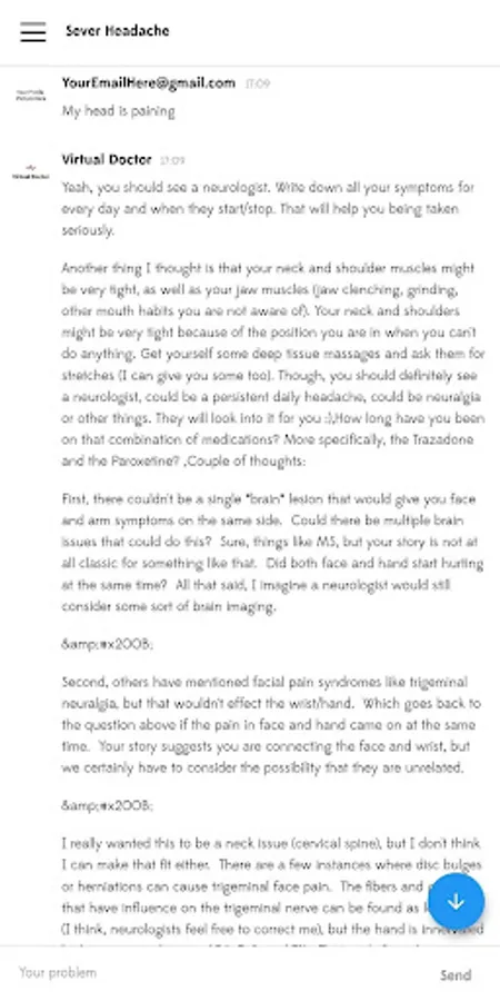 "Medical fees are increasing day by day and daily checkups though important are becoming a luxury rather than a necessity for many of us. This is why I made this app which has an A.I. that can perform a medical diagnosis for free, this way you can be sure if you are in perfect health every day. If you have any major issues, the virtual doctor will suggest you consult a real doctor, till then you can just relax and be assured than your wallet is not going to get hurt by medical costs."