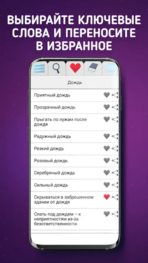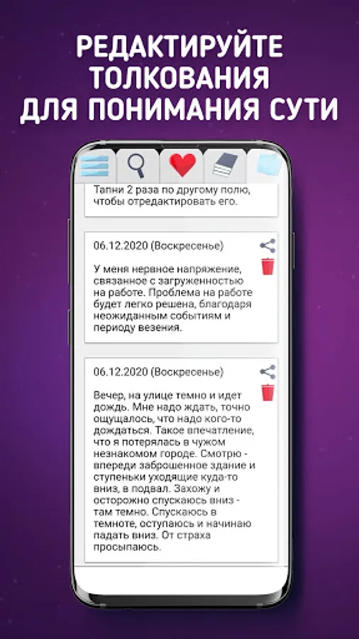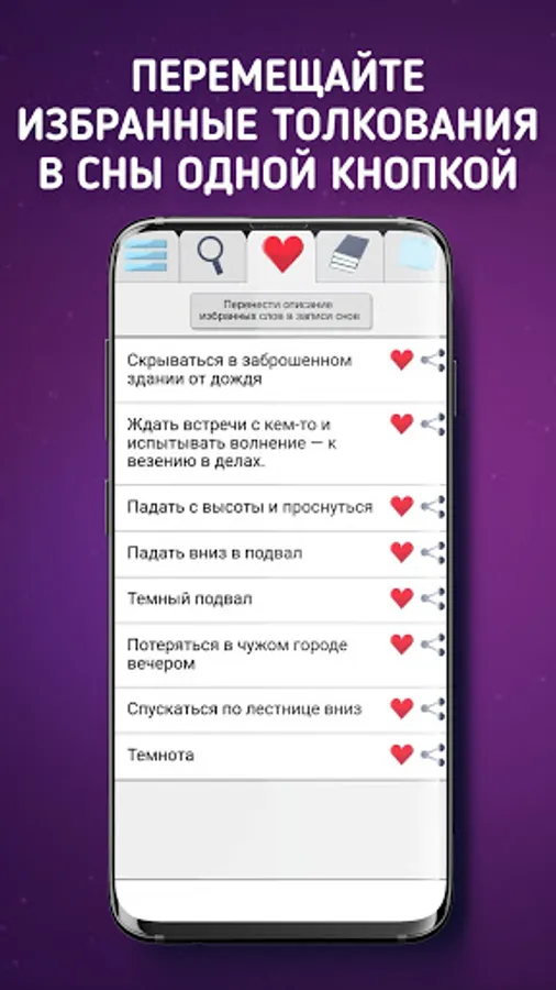 If you want to save the search result to return to it later, add it to “Favorites” and you can read the value at any time you need. So you can collect interpretations for a day, week, month and even a year, and create your personal book of dreams and life events in your phone for analysis. This is your personal interpreter for every day.