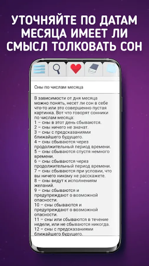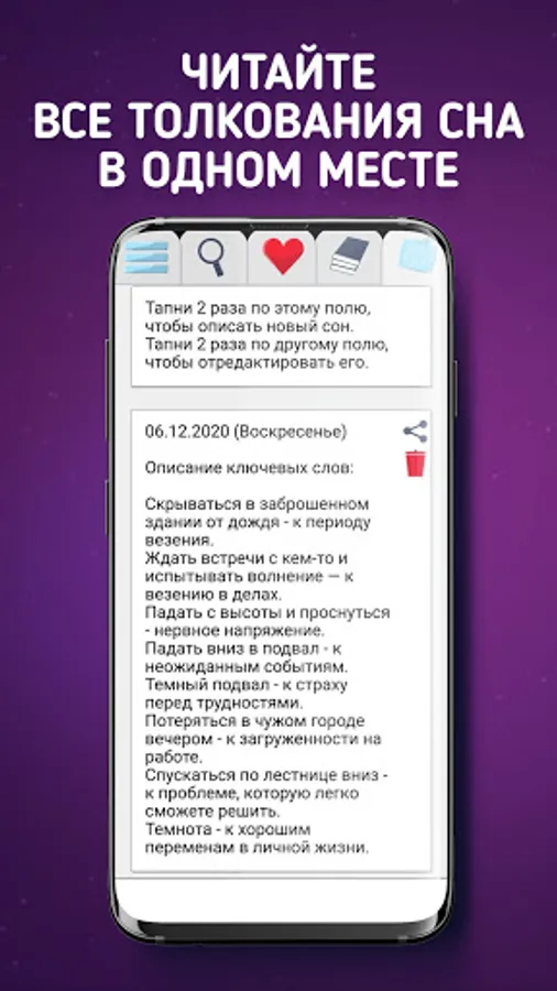 By downloading our app for phones, you can easily understand and analyze your dreams. To do this, you just need to open the Big Dream Interpretation of Dreams, enter a keyword from your dream in the search field and see the result. We will tell you what your online dream means, help you analyze it and understand what events it prepares you for, and what to expect in the near future.