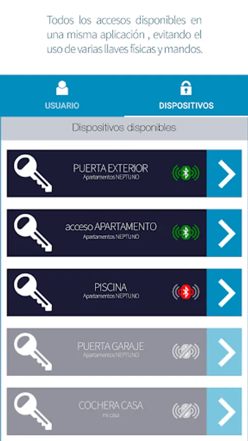 This system allows you the possibility of controlling several inputs from the same APP, knowing the registration of entries made and configuring the devices. With this application you can drastically reduce the number of keys you charge throughout the day. You only need your mobile to open all your doors.