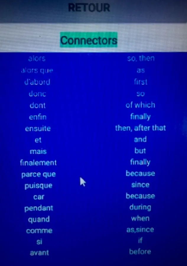 It is a French learning app. It teaches you about connectors and important phrases which helps you in better communication and also in improving your writing skills.