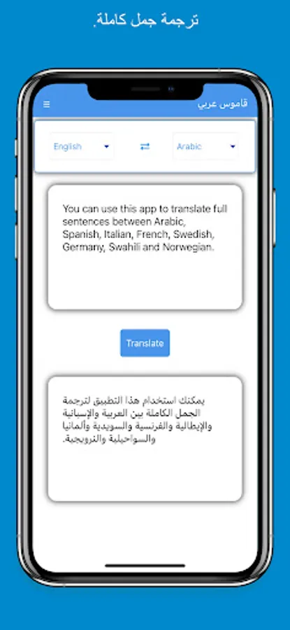 1: You can translate full sentences and define words between Arabic, English, Dutch, French, Italian, Germany, Norwegian, Spanish, Swedish, ,Amharic and Tigrinya.
